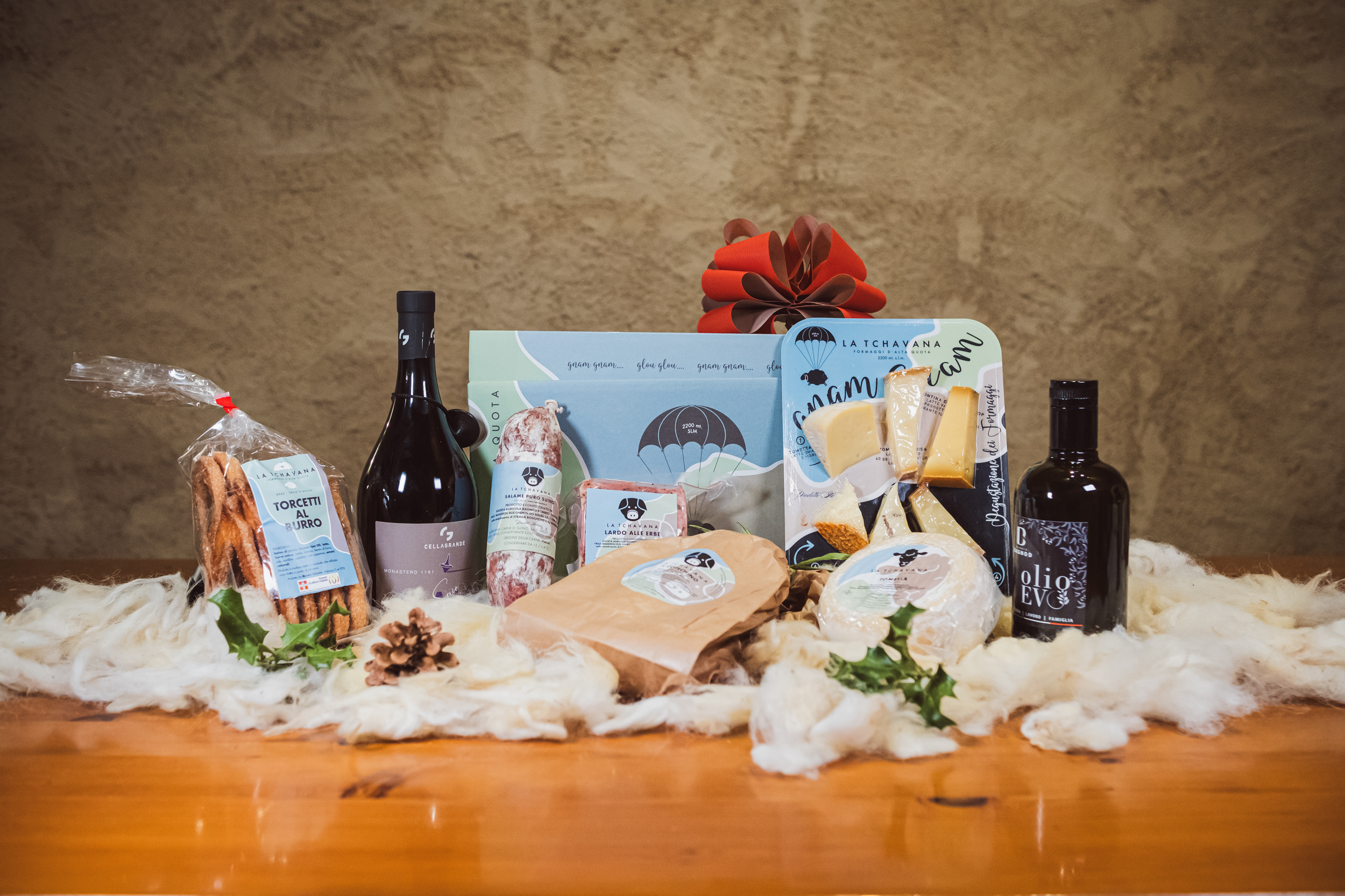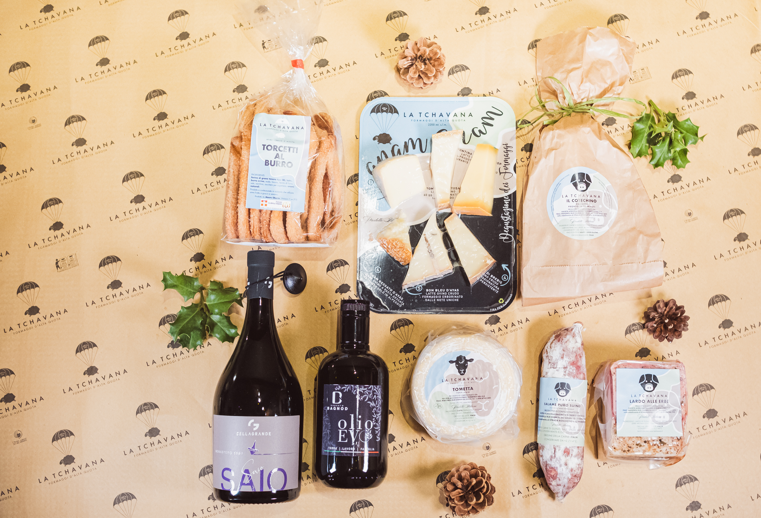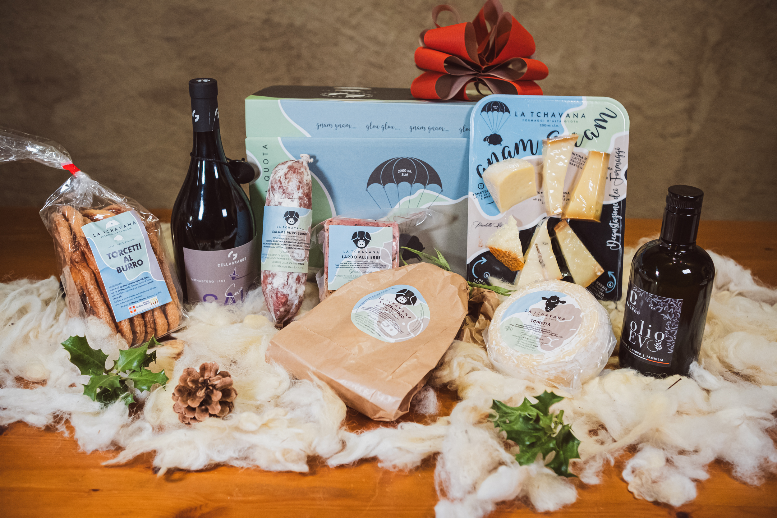 1 bott.Saio Nebbiolo Degustazione di Formaggi d’Alta Quota 200 g circa 500 g Tometta Fresca 300 gr di Lardo alle erbe 1 pacco di Torcetti al burro d’alpeggio 1 Salame di puro suino 1/2 lt Olio Extravergine d’oliva 1 Cotechino precotto