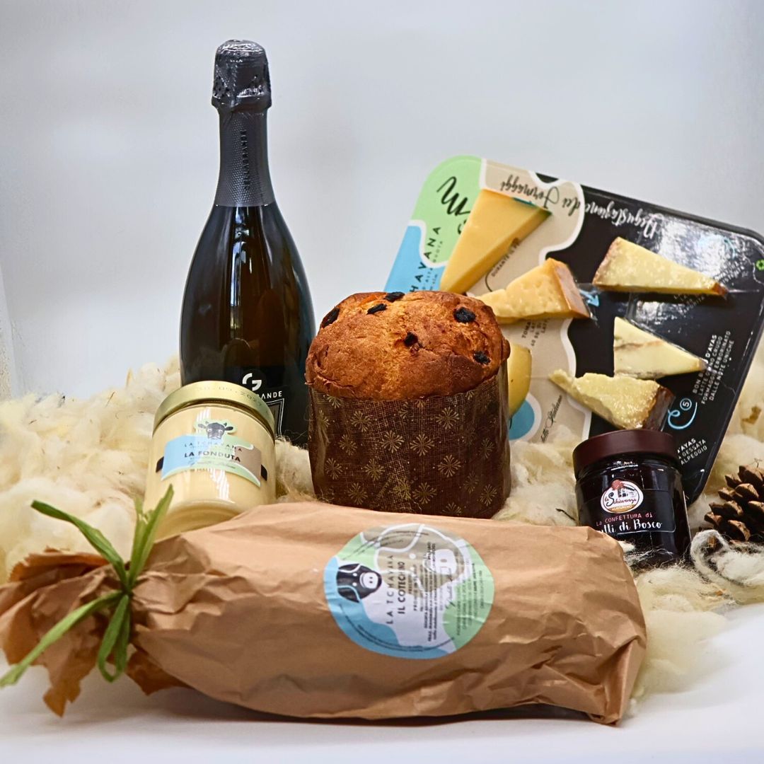 Un cesto equilibrato che racchiude i sapori autentici dell’alpeggio valdostano. La combinazione perfetta tra formaggi d’alta quota, salumi artigianali e i classici della tradizione natalizia, accompagnati da uno spumante d’autore