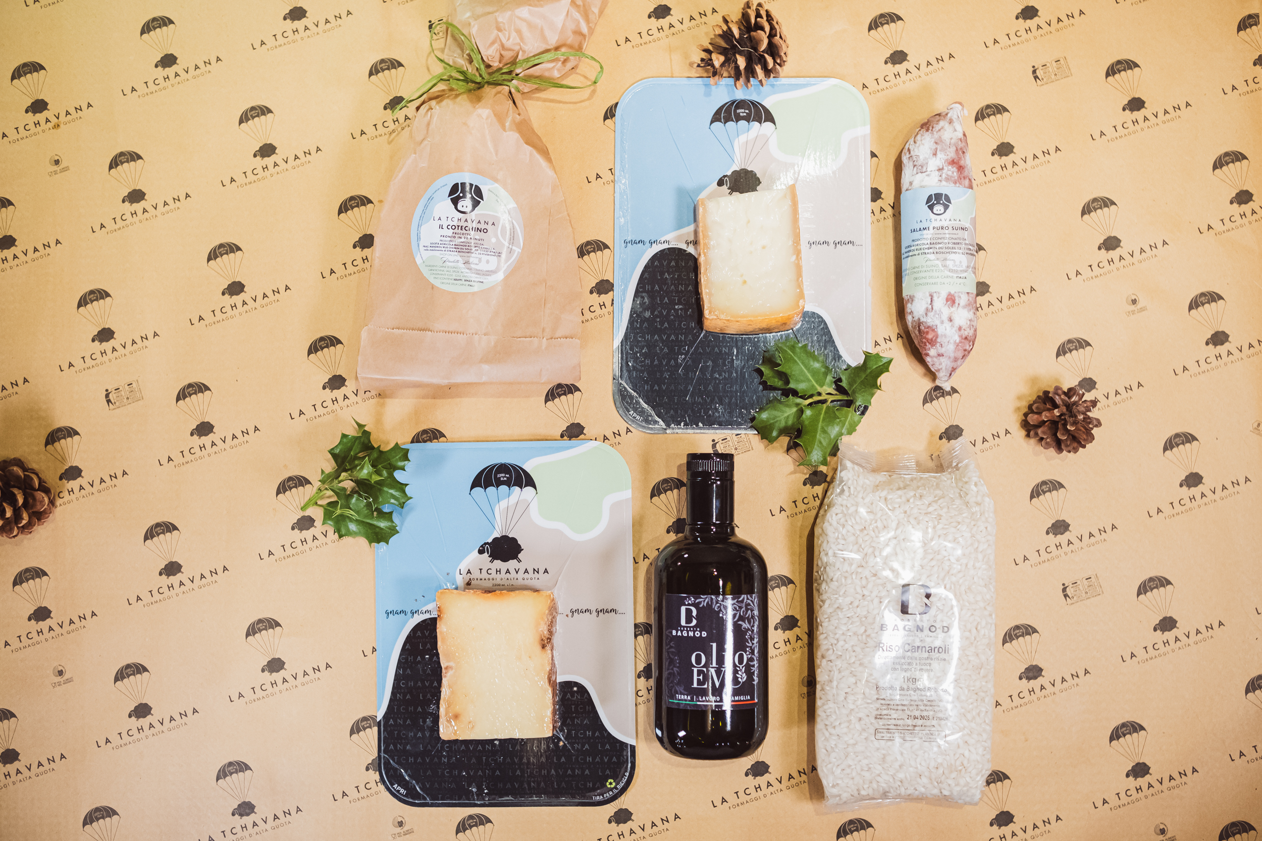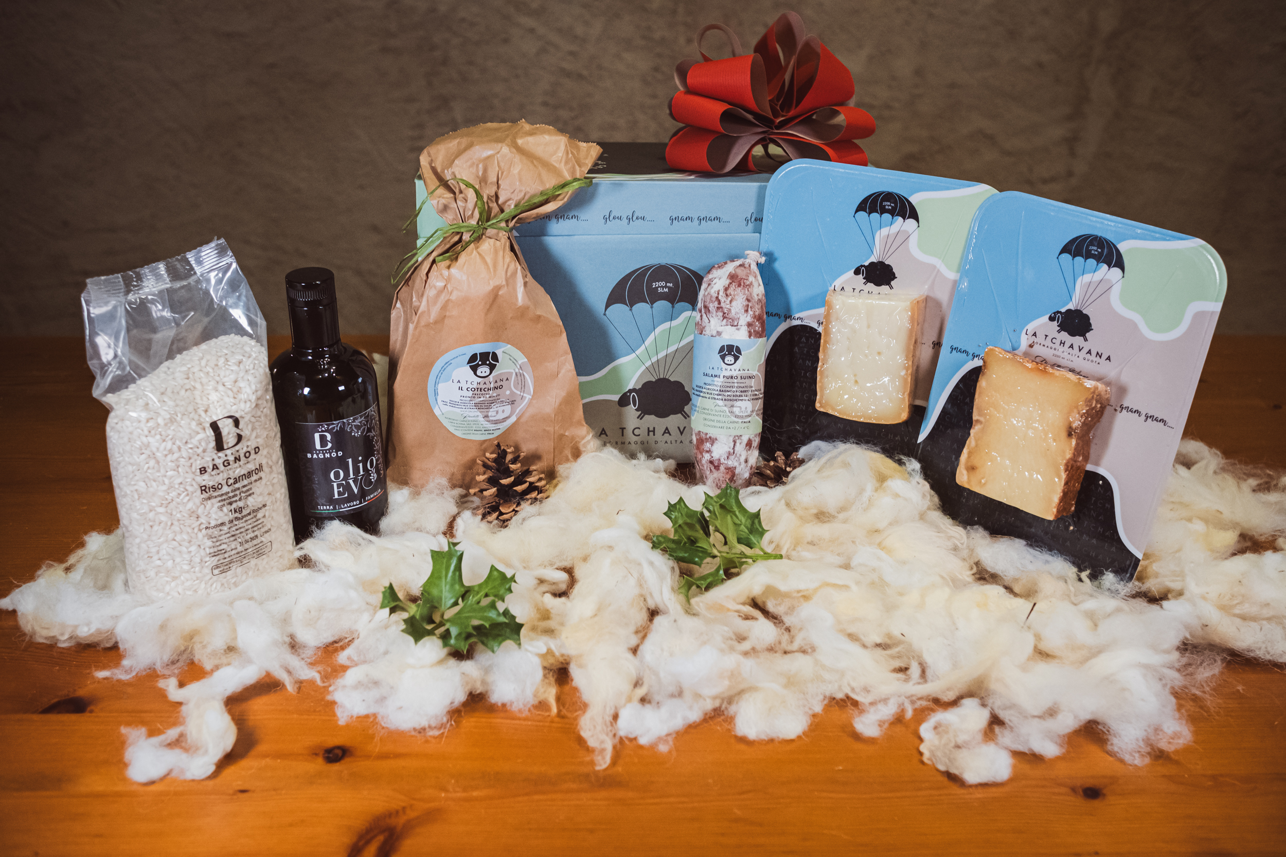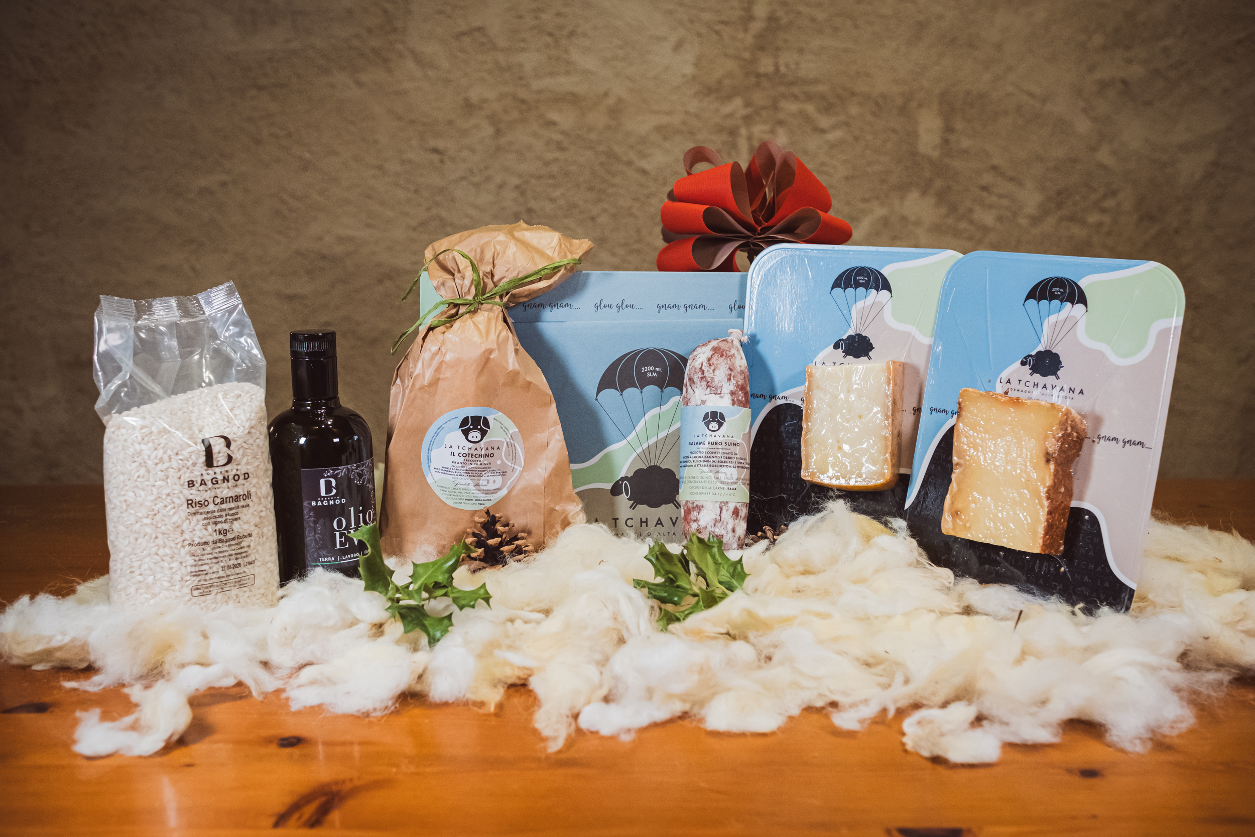 1/2 lt olio Extravergine d’oliva 1 kg Riso Carnaroli 300 g di Gran Gessato d’Ayas 300 g di Neige de Brebis 1 Cotechino precotto 1 Salame di puro suino